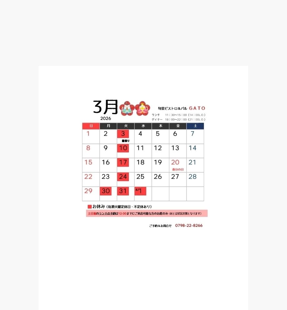 6ヶ月前9月のお休みは、17日(水)を含む毎週火曜日と、24日(水)はランチのみお休みでディナーは通常通り営業します。