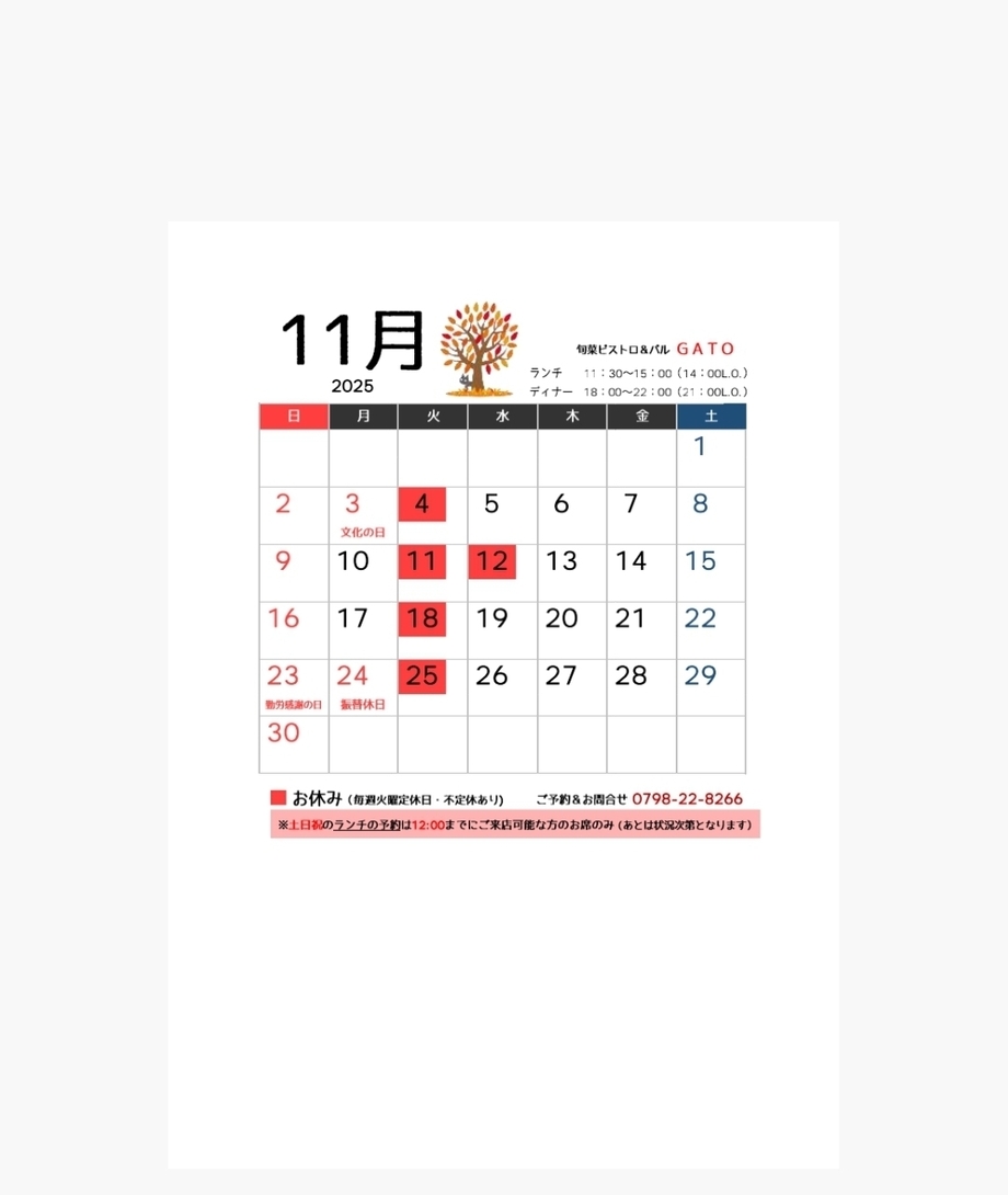11月のお休みは、12日(水)を含む毎週火曜日です!