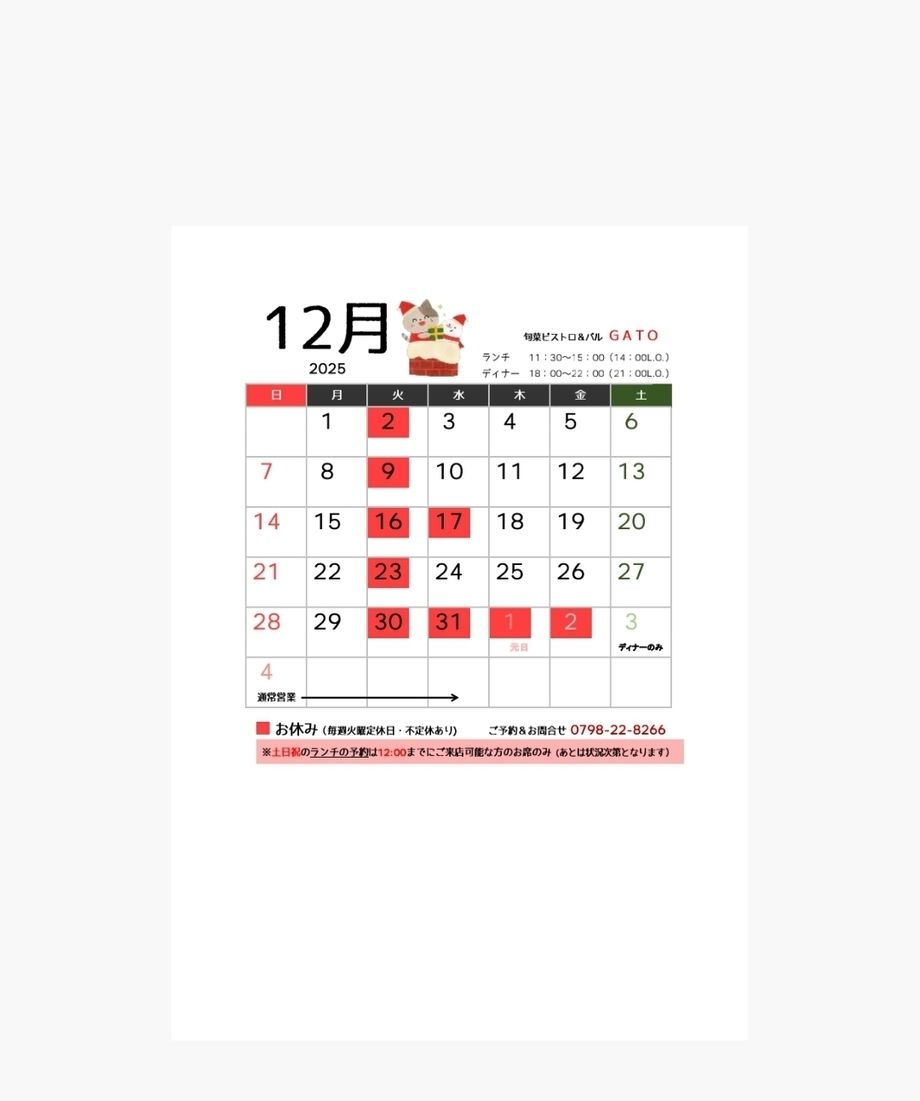 12月のお休みは、17日(水)を含む毎週火曜日と…